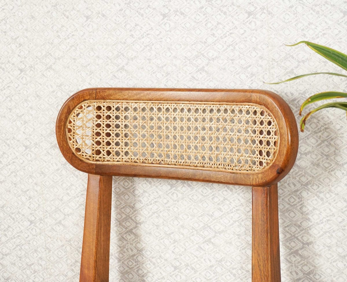and style. Featuring a durable wooden frame and a woven cane or rattan backrest